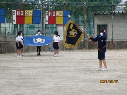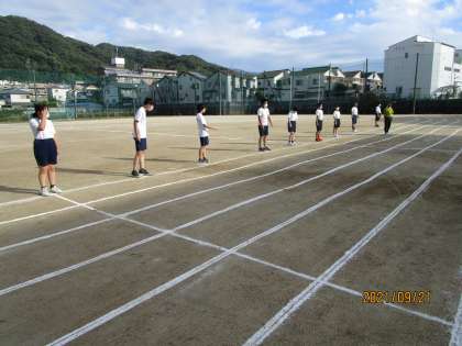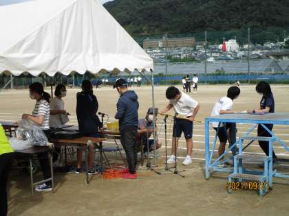 生徒会役員の人たちが入場の練習をしていました。テントが風で飛ばないように杭を打ちました。今日の準備の最後の最後に体育委員がすべての準備を終えたあとにあすの開会式での動きについて練習していました。体育委員の人もおつかれさま。準備に残ってくれたすべての人にありがとうです。校舎内では、人権クラブが太鼓の練習をしていました。美術部の人たちが体育大会の看板を作ってくれました。みんな、ほんまにありがとう。