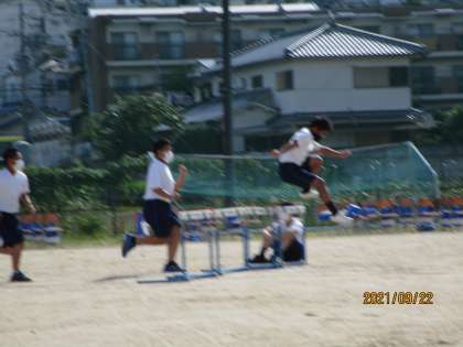 ハードル走です。レースが終わって急いで片付けている準備係の生徒です。ありがとう。