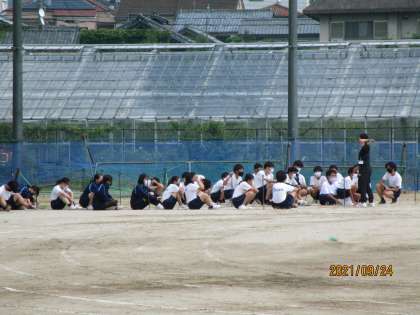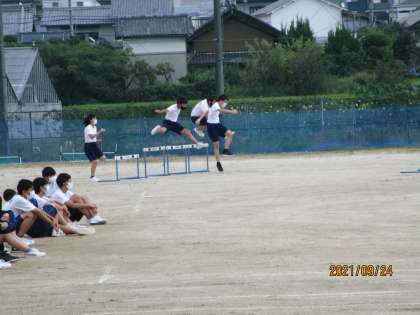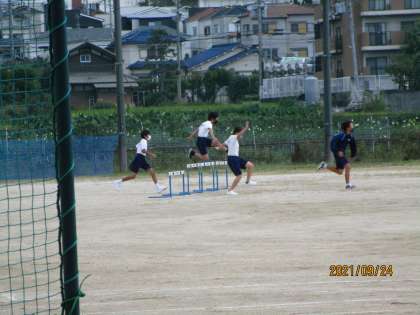男女を一つにして体育をしていました。写真はハードル走の練習です。時間を分けて北中ギネスとハードルの練習を交互に行っているようです。どちらも練習していないとなかなかできません。