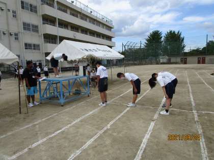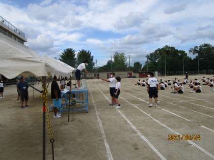 閉会式の練習に入っています。成績発表が終わり、表彰状と優勝カップ等を渡す練習をしています。