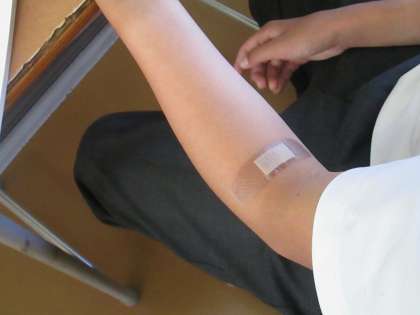 今日の保健体育は保健分野の話です。飲酒の害について勉強しました。腕にアルコールを縫って、数分後に赤くなる人はアルコールに強くないということを表しているそうです。各生徒が実験しました。
