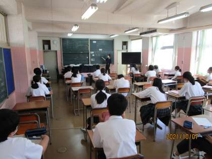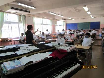 1年の音楽です。「日本で一番古い音楽って何か知っていますか。」という質問をしていました。「能!!」という答えが返ってきました。すごいですね。そこから雅楽の話になりました。