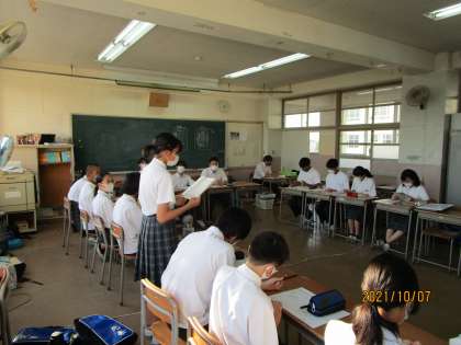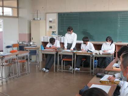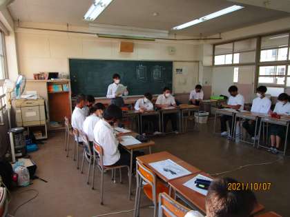 後期第1回の生徒議会です。自己紹介に始まり、各委員会の目標、活動内容について始めに発表し合いました。さすがに学校中のリーダーです。真剣に聞き、自分の意見を発表していました。