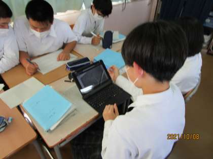 3年の数学の時間です。単元テストに向けて問題プリントを全員が解けるようにしようと授業です。一人だけタブレットを使って勉強しているので、よく見てみると、数時間前の黒板をタブレットで写真に撮っていたようで、それを見なおして問題を解いていました。なるほど、そういった使い方もできるのですね。タブレットの写真機能おそるべしです。先生の指示がなくても黒板を写真に撮っておくといいかもしれません。ただし、特別な事情がない限り、書くことも大事ですよ。