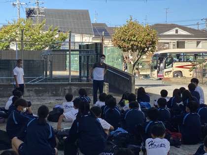 晴天に恵まれました。ありがとうございます。学級委員の進行で出発式がおこなわれまし。メリハリをつけて全員が楽しもうと呼びかけがありました。