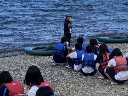 午後はカヤックリレーです。そのルールを聞いています。