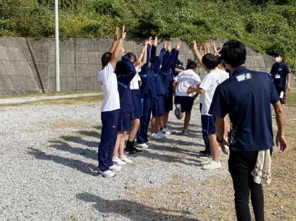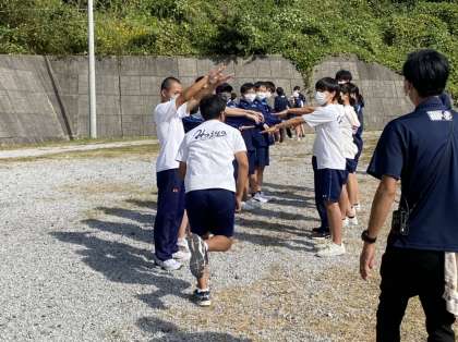 昼からはコミュニケーションゲームをしました。仲間を信頼して行ういくつかのアクティビティを行いました。写真は目の前に仲間が走り抜けるときに一瞬で腕を上げるというものです。