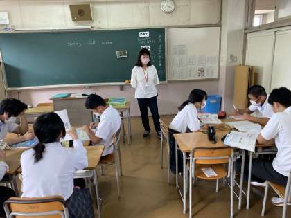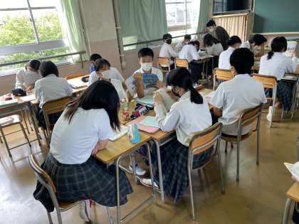3年の英語です。先生からの説明をうけてグループで確認をしています。