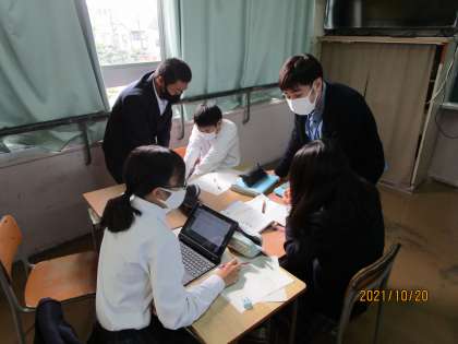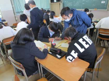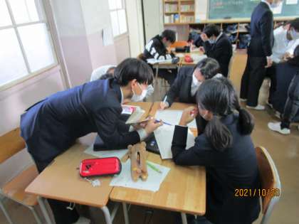 3年生の数学です。この先生は毎時間、班全員が授業プリントを理解できるようになる、というのがねらいです。すばらしいです。生徒たちが自分が解ければ周りの人に声をかけて教え合うのが当たりお前になっています。最後まで集中しています。
