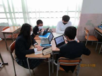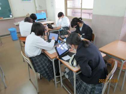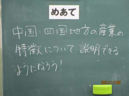 2年生の社会の時間です。中国・四国地方の産業について説明できるようになろうという授業です。まずは、タブレットに中国と四国の地図を出し、産業、産物について何があるのか調べています。