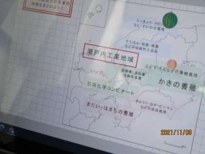 1枚目は先生が学びポケットから生徒に配付した白地図です。2枚目が、先生が用意した「瀬戸内工業地帯」「〇〇石油コンビナート」などの名称カードを生徒が指で白地図に移動させたものです。さらに、その地でそれが発展した理由を考え、画面上に貼り付けます。すばらしいですね。以前も描きましたが「愛媛はミカンの産地」と覚えるだけは古い社会のスタイルで今は、なぜ、愛媛でミカンが穫れるのかというところを考えることで思考力を培います。と書きましたが多くの社会の先生は昔から地理的要因を説明していましたが、今ほど明確に生徒にそこを考えさせようというスタイルではなかったように思います。