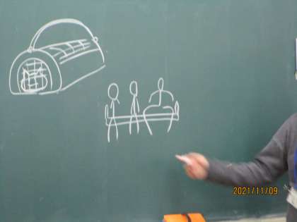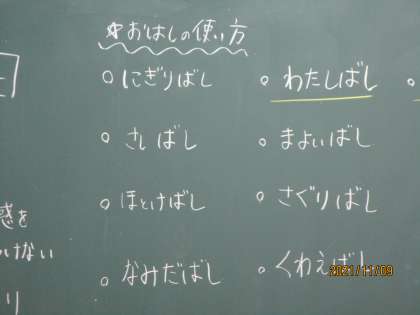 1年生の技術家庭科の時間です。ルール、マナー、決まりなどの話があり、最後にはお箸(はし)の使い方の話になりました。1枚目の写真は電車の座席に足を広げて座るのは、ルール違反か、マナー違反か考えているところです。
