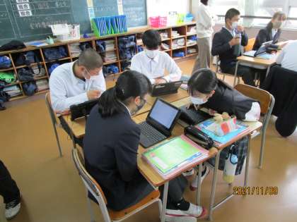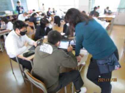 3年生の英語です。マーチンルーサーキングの話です。本文の内容を読んでタブレット上に出された問題に答えているところです。プリントに書いてあるのと、理屈は同じでも生徒の多くはタブレットで答える方がいいようです。今回は自動採点で答えがすぐにわかるやりかたではなく、あとで先生が解説しながら答え合わせをするというスタイルでした。