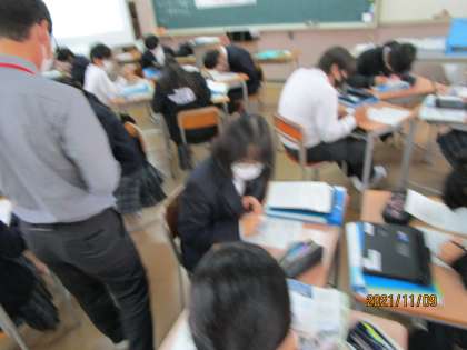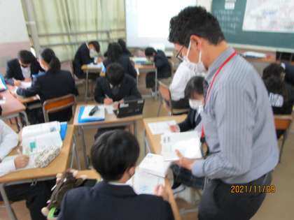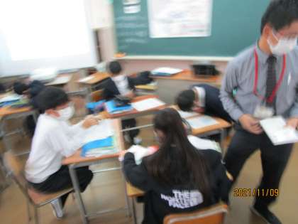2年生の社会です。タブレットで検索するのもいいのですが、多くありすぎて迷うこともあります。シンプルに社会科用語辞典を使うのも大切なことです。先生が「良かったら使ってね。」とグループに一冊渡していました。このグループに一冊渡すということも絶妙な技です。そこで「これちゃうか?」「こっちのことやで。」と話が起こるからです。