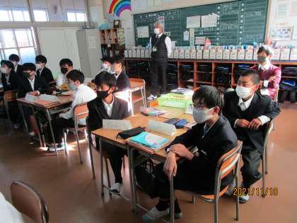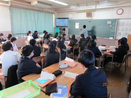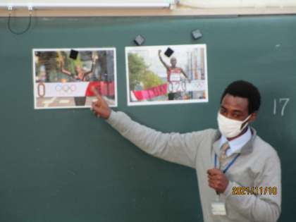 新しく来られた英語のジェームス先生です。出身地のケニアのことを話しています。それがユーモラスで自分が家で寝ていると、近くの湖でカバがやっぱり寝ていて、いびきが聞こえるんです、と言ってカバのいびきをまねしていました。みんな、大笑いです。
