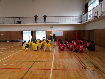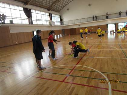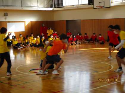 もともと3年生は沖縄修学旅行を予定していました。その沖縄でミニ運動会を計画していました。行けなくなったので、今日の午後に行いました。保護者の方も30人近くお越しになりました。ありがとうございます。学級委員が司会進行です。写真は「サーターアンダギー」という競技です。盛り上がりました。