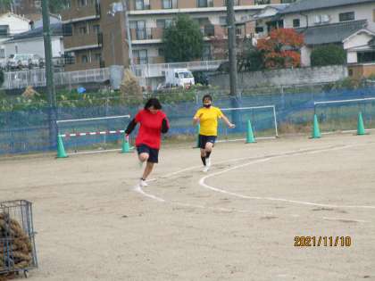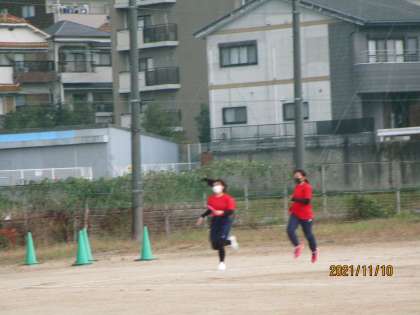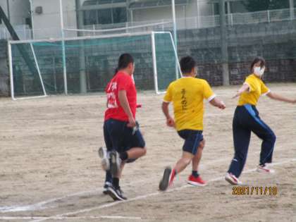外に出て全員リレーです。スタートの先生が「よーい」と言ったとたんに雨が本降りになってきました。全力疾走、全力応援です。先生たちも本気で走ります。