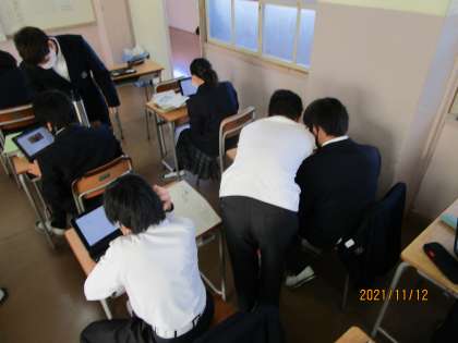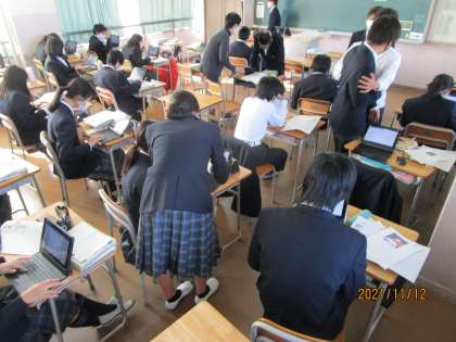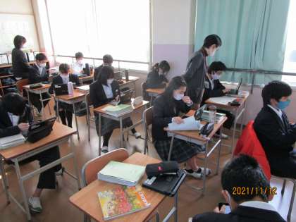 11月20日文化祭展示の部では各教科からも出展します。この授業では1年生の英語で文書を作り、掲示します。その準備をしていました。