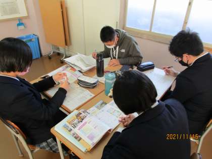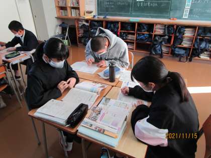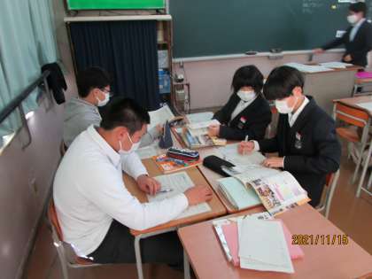 3年生の社会です。問題プリントにチャレンジしていました。班員全員が分かるようにとのことで教えたり、教えてもらったりの展開になると思います。