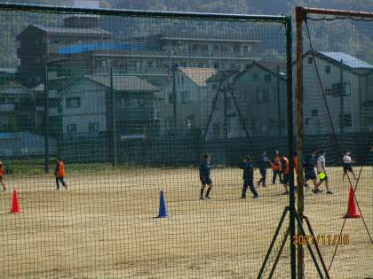 コートを描いて試合形式の練習をしていました。3年生の体育です。3年生は経験もあってやっぱり上手です。