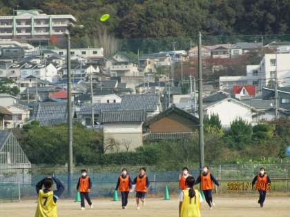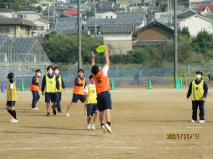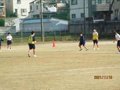 3年の体育です。回を増すごとに上手になってきました。いわゆる団子状態がくずれて、スペースを広く取ってゲームができているように感じました。