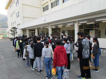 本日、10時10分、北条小学校6年生が第2回アクセスプランで来校しました。アクセスプランとは小学校から中学校に上がって、環境の変化によって不登校等が増えることを減らそうと9年前より始まりました。始めのあいさつで中学校長から、1、北条小の運動会でみんな良かったけど、6年生もすごく良かった。2.中学校の給食を体験してください。3.中学校は今、ノーチャイムです。自分で時間を意識して過ごしてくださいの三つの話をしました。しっかり聞いてくれました。