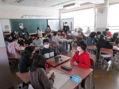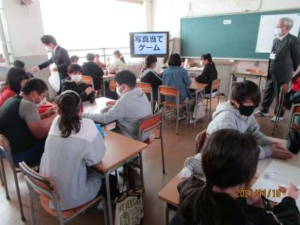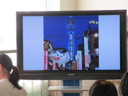 北条小6年生の人たちです。このクラスは中学の社会の授業を先に受けました。クイズ形式で都道府県名を覚えていこうという授業です。第1問は超簡単な問題です。通天閣がテレビに映っています。これがある都道府県名を答えましょう。もちろん、正解は大阪です。このあとはどんどん難しい問題になりました。