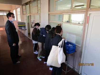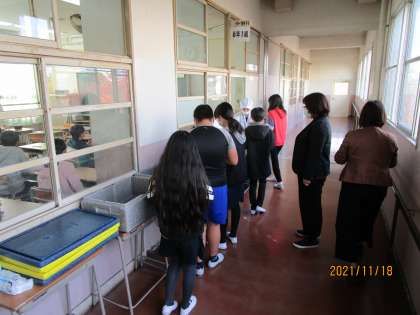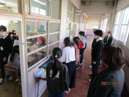 運んできたおかずやご飯を廊下に並べます。新型コロナの関係で、一人ひとりが自分の分を取っていきます。