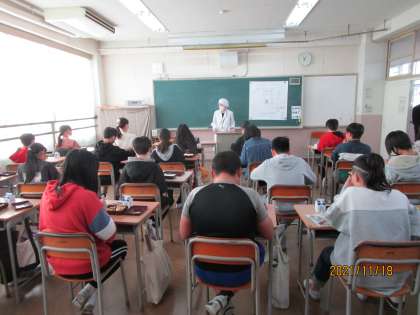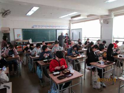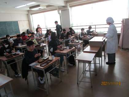 おいしく給食を食べているところです。食後にインタビューすると「思っていたよりおいしかった。」と答えてくれました。小学校の校長先生は中学の給食が好きで好きでたまらないそうです。