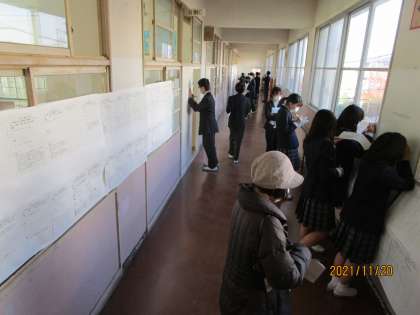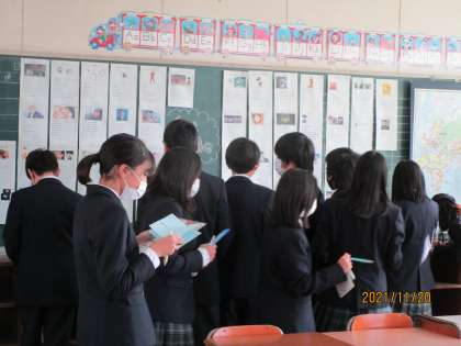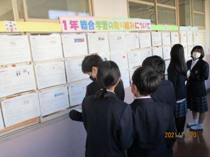 数学の展示、問題を作り、自分で解きました。英語の展示です。次は、1年生の総合学習の成果物です。