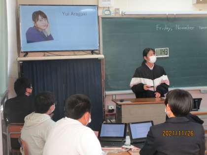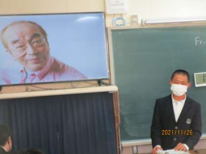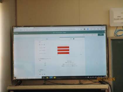 3年生の英語です。お気に入りの人物を英語で紹介し、かつ、生徒が生徒に英語で質問をして英会話を行います。これが結構英語のやり取りができていました。継続は力なりですね。そして、そのやり取りを評価してフォームズに入力すると、瞬時にして○○さんは全員が評価A(赤)という評価と「発音と質問のやり取りがスムーズだった。」というコメントがテレビに表示されます。今、発表した人の評価がすぐにアンケート集約されるのです。すばらしいですね。肯定評価をみんがするのがすばらしい。やる気がグングン出てきます。