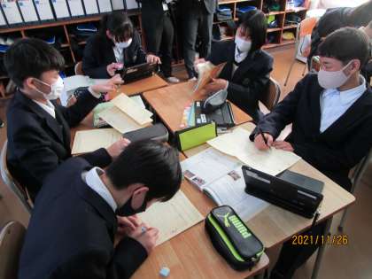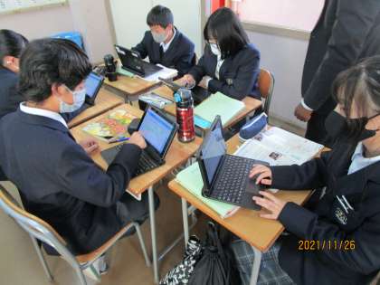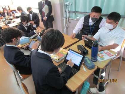 研究授業シリーズのラストです。1年生の英語です。タブレットの画面に単語が無秩序に並んでいます。現在進行形を習ったところで、それを用いて正しい順に並べていきます。指(ペン)で動かしてやっていました。画面上なので何回もやり直しができて楽そうです。各自が作った答えを先生が一斉にパソコン上で回収できます。こういうツールも使わない手はありません。