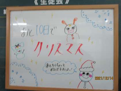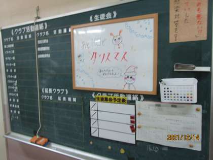 生徒会の掲示板です。去年の今頃、美術部の人と「クリぼっち」について話し合ったのを覚えています。「クリぼっち」とはクリスマスを一人で過ごすことだそうです。生徒会役員の人たちは何とか明るい話題を提供しようとがんばってくれました。ありがとう。