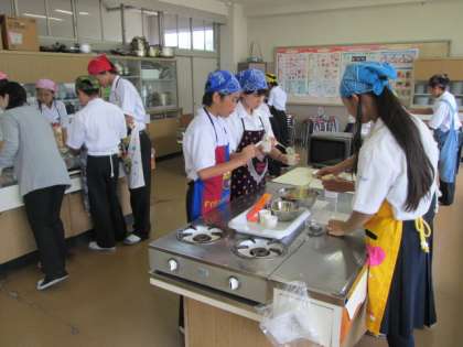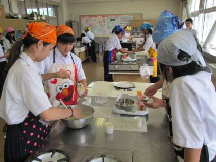 1限に1年3組が調理実習でチョコむしパンを作っています。