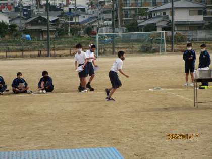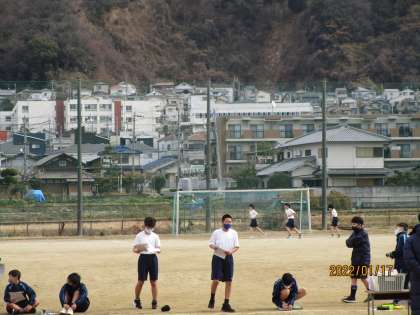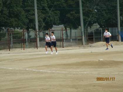 1年生男子の持久走です。今日は15分間走です。途中でしんどくなると歩く生徒もいますが、応援の声でまた走り始めます。すばらしい。