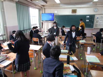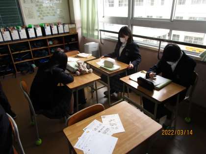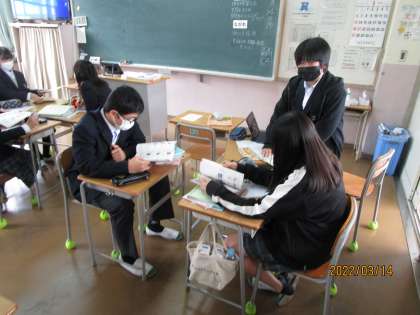 1年生の英語です。本来なら机をきっちりつけて協同学習といいたいですが、コロナ対策で机のすきまをつくって班学習をしています。今日は1年生の英語で習ったことをもとに互いに問題をつくってみようという授業です。なるほど。