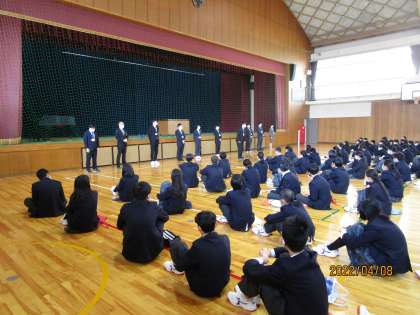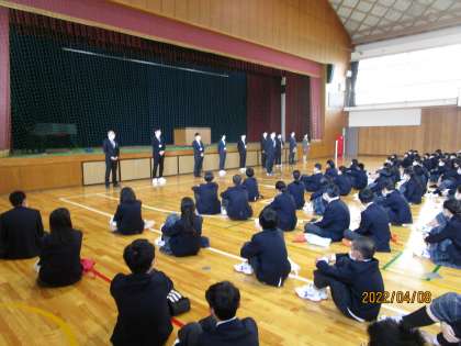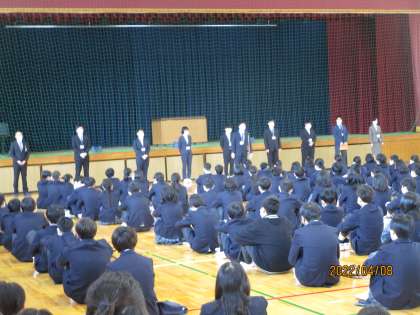 式辞のあとに本校を去られて先生、新しく来られた先生の紹介をし、新しく来られた先生にあいさつをいただきました。また、全学年、学校全体に関わる先生の紹介もしました。