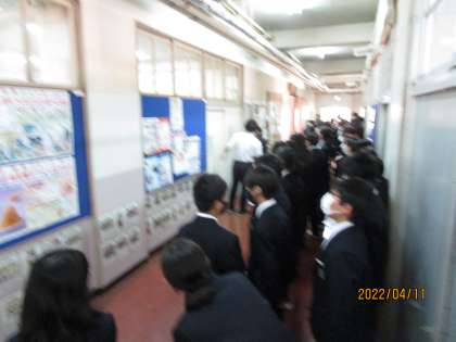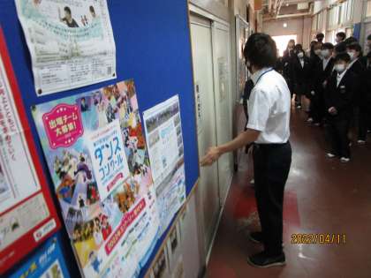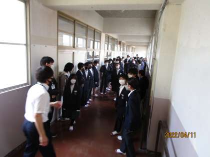 新入生恒例の校内見学を行いました。学年の先生が「ここは理科室です。」「ここは保健室です。」と説明しているところです。1年生、静かに聞いていました。すばらしい。