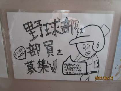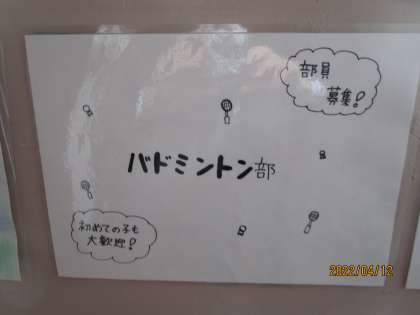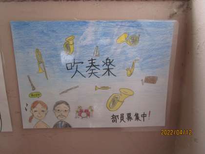 2階に向かう踊り場にクラブ紹介ポスターが掲示されてます。1年生が見て上がります。