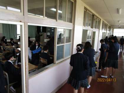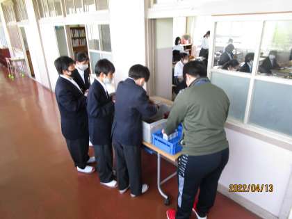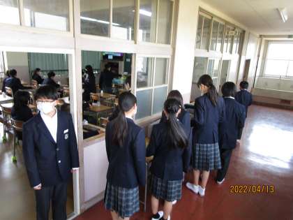 1年生が中学の給食の3日目です。素直に先生の指示を聞くことができます。コロナのことがなければ給食当番がおかずとごはんを各生徒に手渡しをしていたのですが、感染対策で今は、廊下におかれたおかずとご飯を生徒が自分の分だけ取りに行くようにしています。