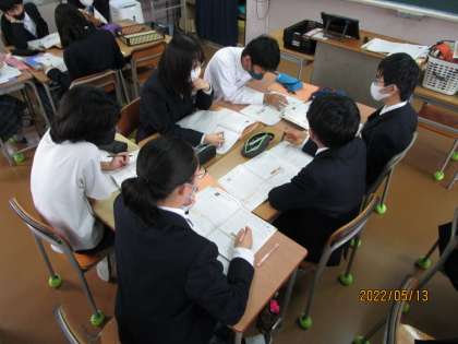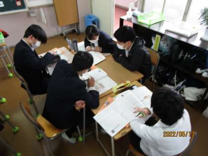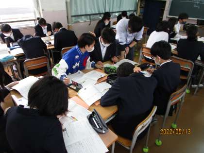 授業の終わりの10分に見学に行きました。全員が教科書をにらみ、あるいは相談し、課題に向かっています。集中度の高さを感じる授業です。