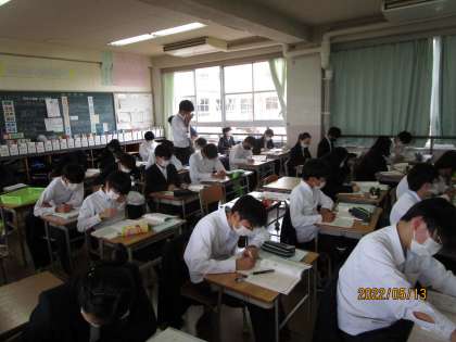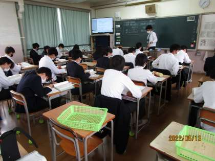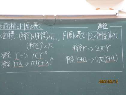 円の面積、円周との関係などが黒板に書かれていました。今日はこの分野の証明問題を解いていました。先生が「まず、教科書の証明を写すように。何も考えず写すのではなく、なんでそうなるか考えながら写すことが大事。」と繰り返し言っていました。