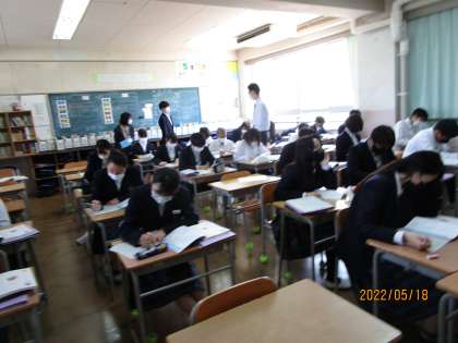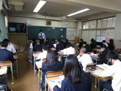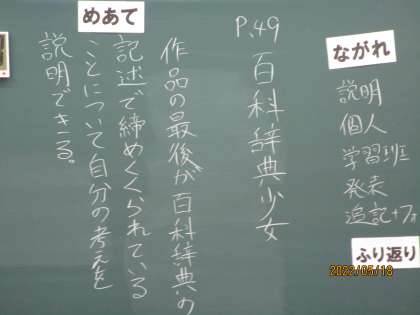 今週は先生たちが意識して授業を交流し合おうという週間です。3年生の国語の先生がぜひ見に来てくださいということで見学しました。教材文が百科事典の説明で終わっていることの意味を考える授業でした。とても集中していました。