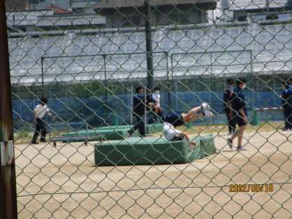 走高跳の授業が始まります。今日は、お尻からマットに安全に着地する練習をしていました。