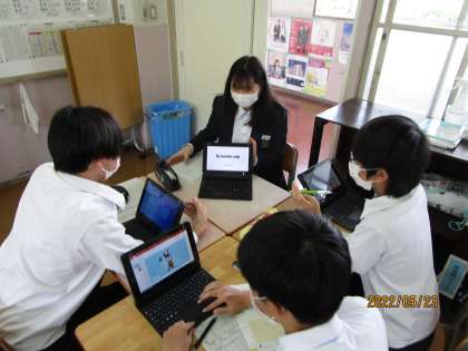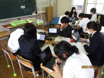 さっそく班の中で発表が始まりました。見学中に何度も感じたことですが、英語を楽しんでいる様子が強く感じられて、気持ちが良いほどです。ある生徒は、「昨日、遅くまで練習してきた。」と力の入ったコメントをしてから、発表していました。すばらしいですね。聞く方の態度もしっかりしていました。