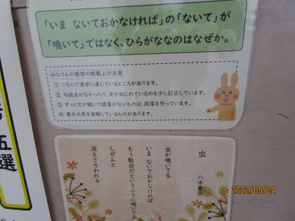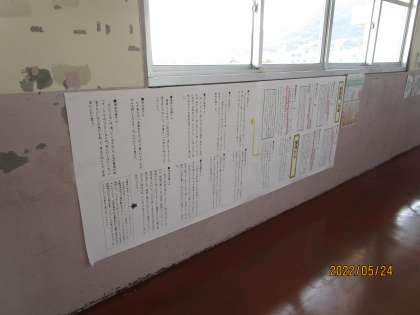 1年生の廊下に掲示してありました。国語で学習した詩の読み取りを各自表現したものです。詩の中の「ないている」という部分に着目して、なぜ、ひらがなですか?という問いに答えたものです。数人しか読んでいませんが、「泣く」「鳴く」「なく」のちがい、ひらがなと漢字の違いなど、それぞれの考え方が表現されていました。どれもすばらしいと思いました。