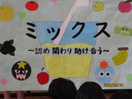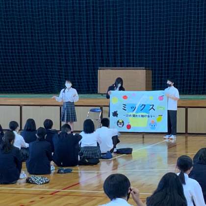 すばらしいと先に言います。前期生徒会活動目標の紹介を今朝の生徒集会で生徒会役員がしました。いろいろな考え、いろいろな人、いろいろなやり方、全部を受け入れる、そんな気持ちのこもったテーマです。世界中どこに紹介しても恥ずかしくないと思います。