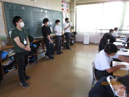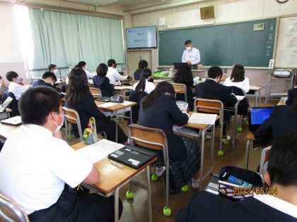 市教育委員会所属のICTの専門家の方に講師に来ていただきました。1年生では6月1日に万博に校外学習に行き、Eスポーツを体験します。そのときのことを学校に帰って後日、プレゼンする機会を設けます。そのプレゼンの仕方について専門の方より話を聞きました。
