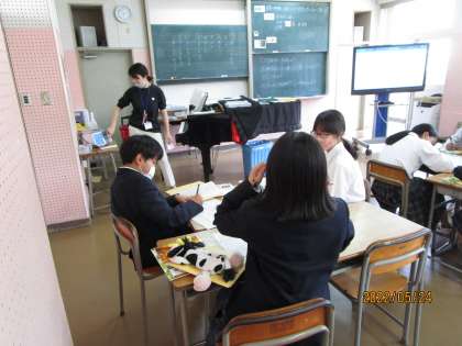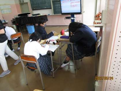 有名な音楽家の協奏曲をDVDで聞いていました。ただ聞くだけではなく、情景を浮かべながら聞きます。小鳥のさえずり、季節、風のにおい、人々の表情、楽しいのか悲しいのか、いろいろ想像して聞いていました。ある曲が流れると生徒から「あ、先生。これ、ぼくのテスト中の頭の中や。」と答える人がいました。すると、「いやいや、テスト前の頭の中や。」と返す人が。先生もみんなが一生懸命に聞いて、素直に回答してくれたことに大満足の笑顔でした。すばらしい。