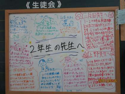 今日は2年生の先生方へのあったかいメッセージです。涙が出ます。職員室に入って、2年の先生に伝えると、さっそく見にいっていました。生徒会役員の人たち、ほんとにありがとう。
